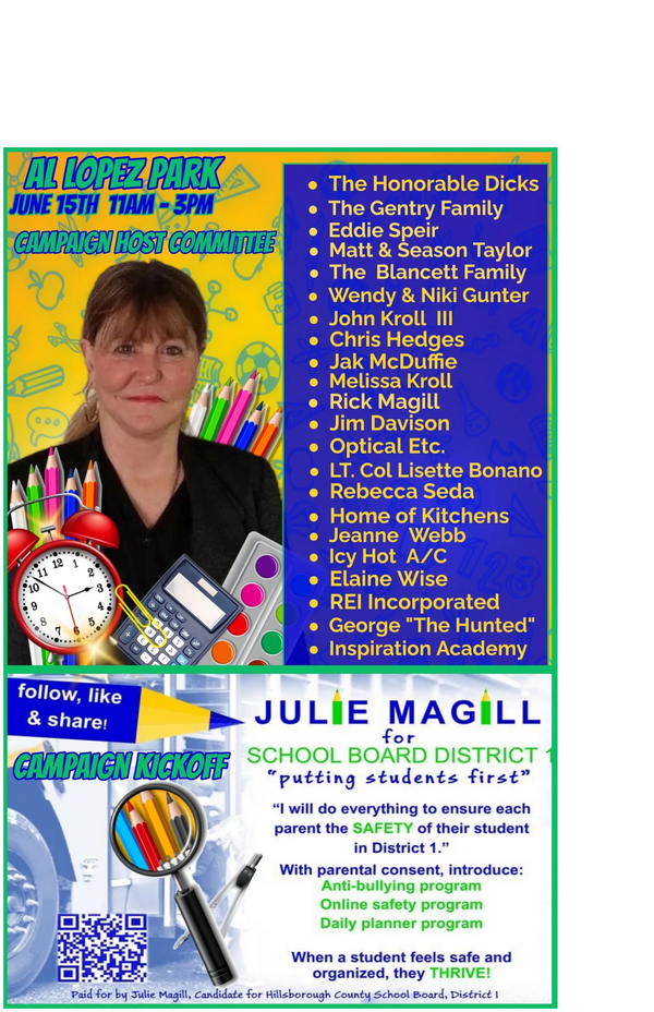 William March with Tampa Bay Times article is Our picks for Hillsborough County School Board | Times Editorial Board recommendations 7/24/24....... puts out recommendations and this.... "Layla Collins, 48, a U.S. Army veteran, offered a series of vague responses to a Times questionnaire. Collins’ campaign is well-funded by special interest groups that have a stake in currying favor with her husband, Republican state Sen. Jay Collins of Tampa".